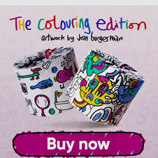 12 limited edition wrapper designs by Jon Burgerman which are super cool. We use the paper to wrap presents and love how it looks in our home.